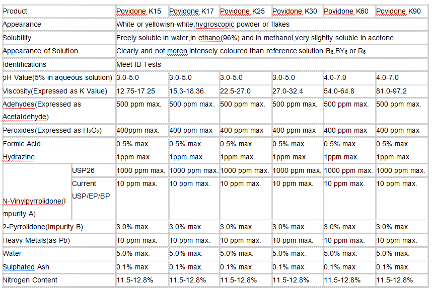 Product Properties: Povidone is a hygroscopic polymer ,supplied in white to creamy white powder or flakes,ranging from low to high viscosity & low to high molecular weight,which characterized by K Value.It’s easily soluble in water and many other organic solvents,with excellent hygroscopisty,film-forming,adhesive,chemical stability and toxicological safeness characters.